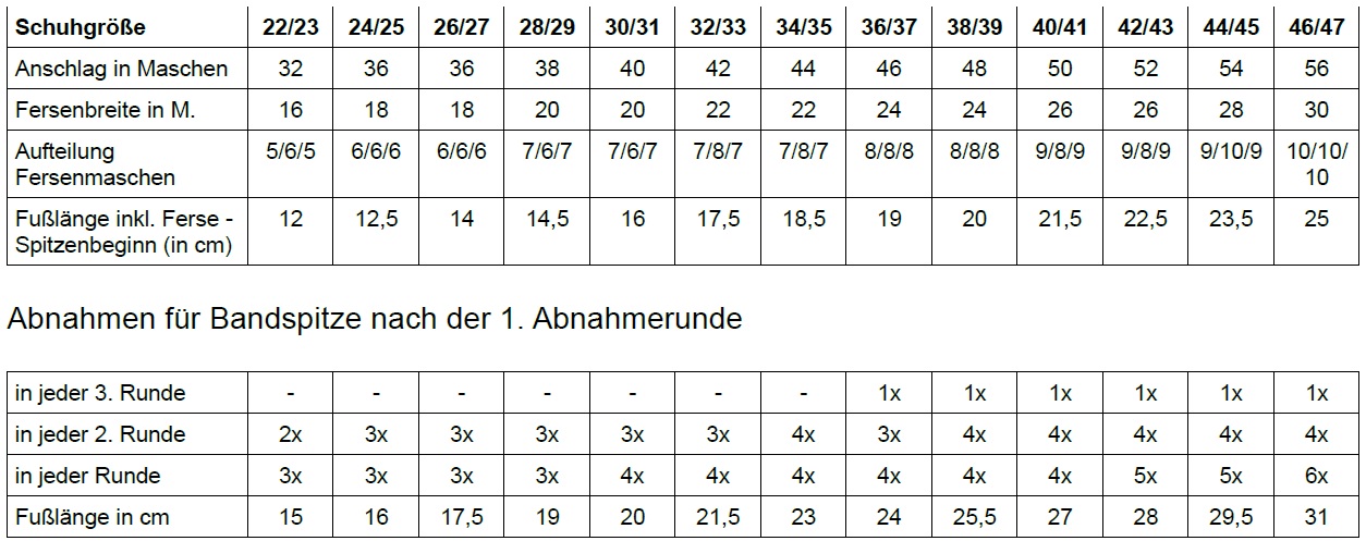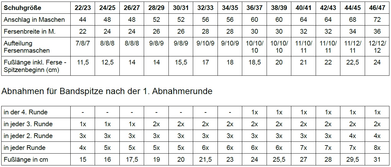Anleitung Technik des Sockenstrickens als PDF zum GratisDownload. Für die Abnahmen zur Spitze der Socken hin benötigen Sie ein letztes Mal die Größentabelle Nun geht es um die Spalte „Abnahmen für Bandspitze jede “ Es ist nämlich so, dass die Spitze zu Beginn abwechselnd aus Abnahmerunden und normalen Runden mit rechten Maschen gestrickt wird. Hier zeigen wir Ihnen in einer Übersicht, welche Masse Sie für das 4,6, und 8fädige Socken stricken benötigen inklusive Sockentabelle.
