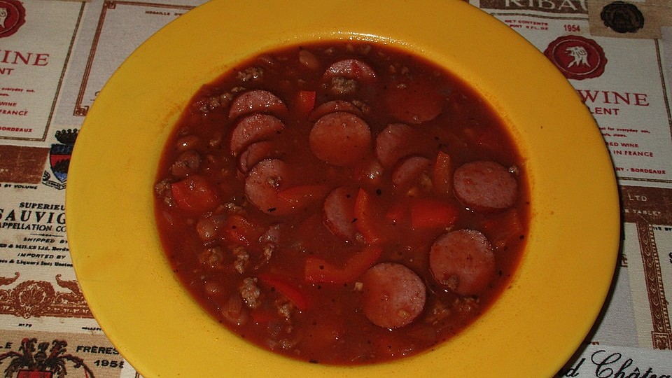 Mitternachtssuppe Rezept von Andy · 1 Juli 00 Menge 1 keine Angabe vorh Zutaten 750 g Thueringer Mett 2 gross Gemuesezwiebeln 2 rote Paprika 2 gruene Paprika 1 Dos Tomaten 1 Dos Erbsen 2 Dosen Mais 1 Paeckchen Tomatensuppe (1l) Tabasco.
