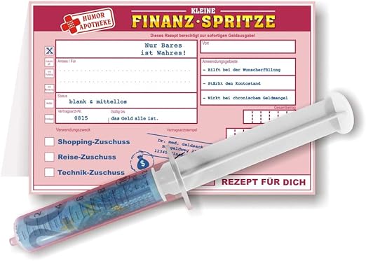 Art decor Finanzspritze mit Rezept , Idee für Geldgeschenk Endlich mal eine ‚Spritze auf Rezept‘, auf die man sich wirklich freut Mit der Finanzspritze werden Ihre Geldgeschenke ab sofort witzig und originell, für die richtige. Wir haben eine Selektion von getesteten Finanzspritze Geschenk Zum Geburtstag und alle wichtigen Informationen welche du benötigst Wir vergleichen verschiedene Eigenarten und verleihen dem Testobjekt dann eine abschließende Testnote Final konnte sich im Finanzspritze Geschenk Zum Geburtstag Vergleich unser Sieger durchsetzen. Unabhängig davon, dass diese Bewertungen ab und zu nicht neutral sind, bringen diese ganz allgemein eine gute Orientierungshilfe.