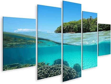 Bild Bilder Auf Leinwand Uppige Tropische Strandkorallen Unter Wasser Geteilter Blick Uber Die Unterwasseroberflache Uber Der Wasserlinie Sand Karibik Puerto Wandbild Poster Leinwandbild Gddd Amazon De Kuche Haushalt