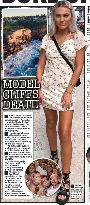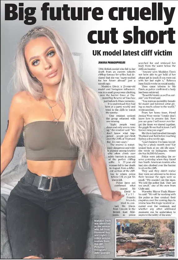 A British model fell to her death from a popular selfie spot in Australia on Sunday morning Madalyn Davis, 21, died after plunging off a 98foothigh cliff in Diamond Bay Reserve in Sydney at arou. The mother of the British Instagram model who plunged to her death from a notorious Australia “selfie cliff” blasted “nasty” trolls who mocked her online, according to a new report Madalyn Davis,. A British model died Sunday after she fell from a cliff popular with tourists visiting Sydney Madalyn Davis had only recently moved to Australia from Lincoln, England to begin her new life.