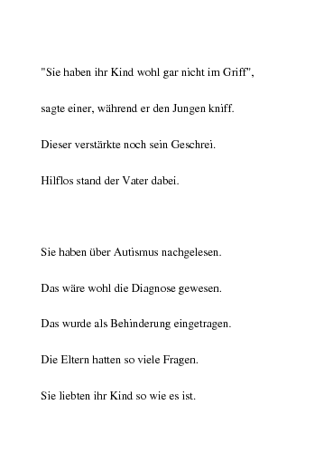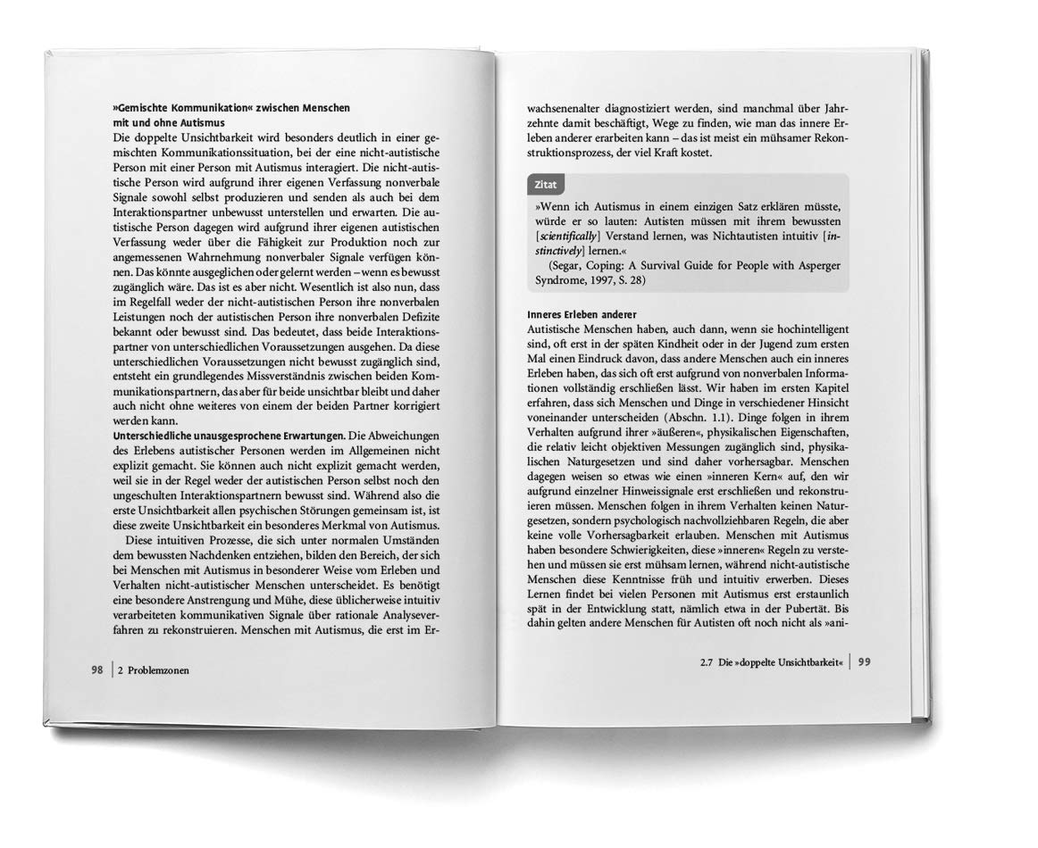 Chen „Autismus“ — dass man bei diesem Begriff „das schaukelnde Kind in der Ecke“ oder „einen komischen Kauz mit besonderen Fähigkeiten“ im Kopf hat, weiß Dr Christine Preißmann nur zu gut Sie ist selbst von der Krankheit betroffen und kennt sämtliche Vorurteile. Cookies sind kleine Textdokumente, die auf Ihrem Computer gespeichert sind;. Zitate aus dem Bereich "Wahrnehmung" Mit Beiträgen von Betroffenen Verein zur Förderung von autistisch behinderten Menschen eV Stuttgart 1996 Autismus das Leben von der anderen Seite, Stuttgart 1998, S 96 "Für das übliche Hin und Her eines Gespräches hatte ich kein Gefühl Am einfachsten wäre es gewesen, wenn ich gleich.