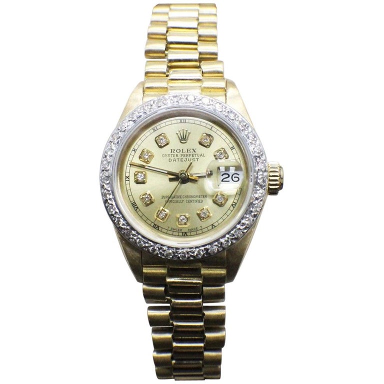 Choose PayPal Credit at Checkout or Instore Financing 6 months at 0% interest Great Reviews From Online Shoppers. Rolex Datejust in 18k with custom diamond dial, custom diamond bezel and retightened original President bracelet Auto w/ sweep seconds and date 26 mm case size Ref Circa 1984 Fine Preowned Rolex Watch Certified preowned Dress Rolex Datejust watch is made out of yellow gold on a 18k bracelet with a 18k Deploy buckle. Rolex LadyDatejust 26 Women's Watch This 26mm luxury watch features a solid 18k yellow gold case with a fluted bezel and a President bracelet The champagne dial has luminescent hand and index hour markers with a date window displayed under a cyclops lens at 3 o'clock.