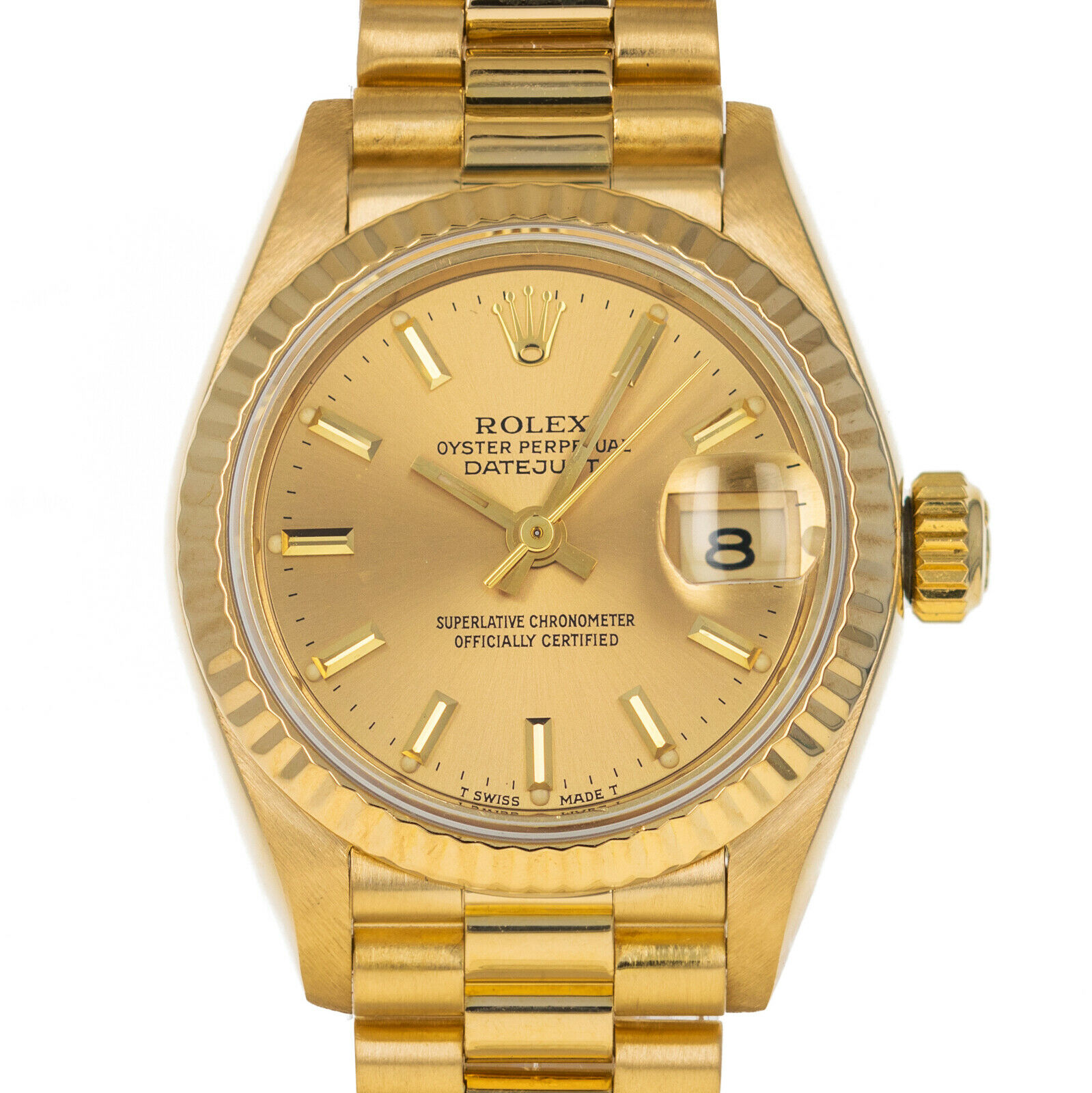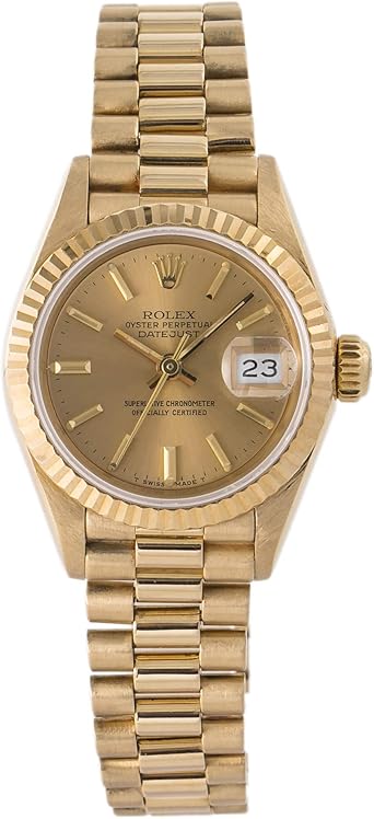 Rolex Datejust Yellow Gold Ladies 1990 Champagne Diamond Dial President Bracelet Automatic Box, One Year Warranty & Guaranteed Authenticity. This is an authentic ROLEX 18K Yellow Gold Diamond Ruby 26mm President Datejust Watch Champagne The watch is crafted of 18 karat yellow gold Features include a gold dial with diamond accents, ruby hour markers, a date display, a sapphire crystal, and a fluted bezel and crown Please note the crystal has several small chips at the edge. Datejust Rolex Sku 4647 Model £7, Or from £ per month View Finance Plans This watch features a solid 18ct yellow gold 26mm case, a champagne dial with baton hour markers, automatic movement, sapphire crystal glass and is set on an 18ct gold president bracelet with concealed clasp It comes complete with a.