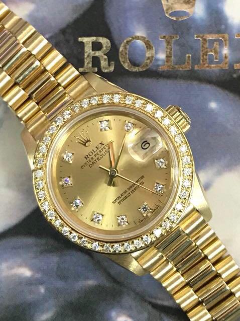 Free shipping and guaranteed authenticity on Rolex Champagne President Datejust Linen Dial Yellow Gold Ladies WatchStock Number Rolex President Datejust Line. Hi All, I’m selling a 1990 E serial Rolex Datejust “Lady President” in 18K yellow gold with a diamond and ruby string dial, here are the details Dial Near mint condition original Rolex diamond and ruby dial with tritium hands Case Ne.