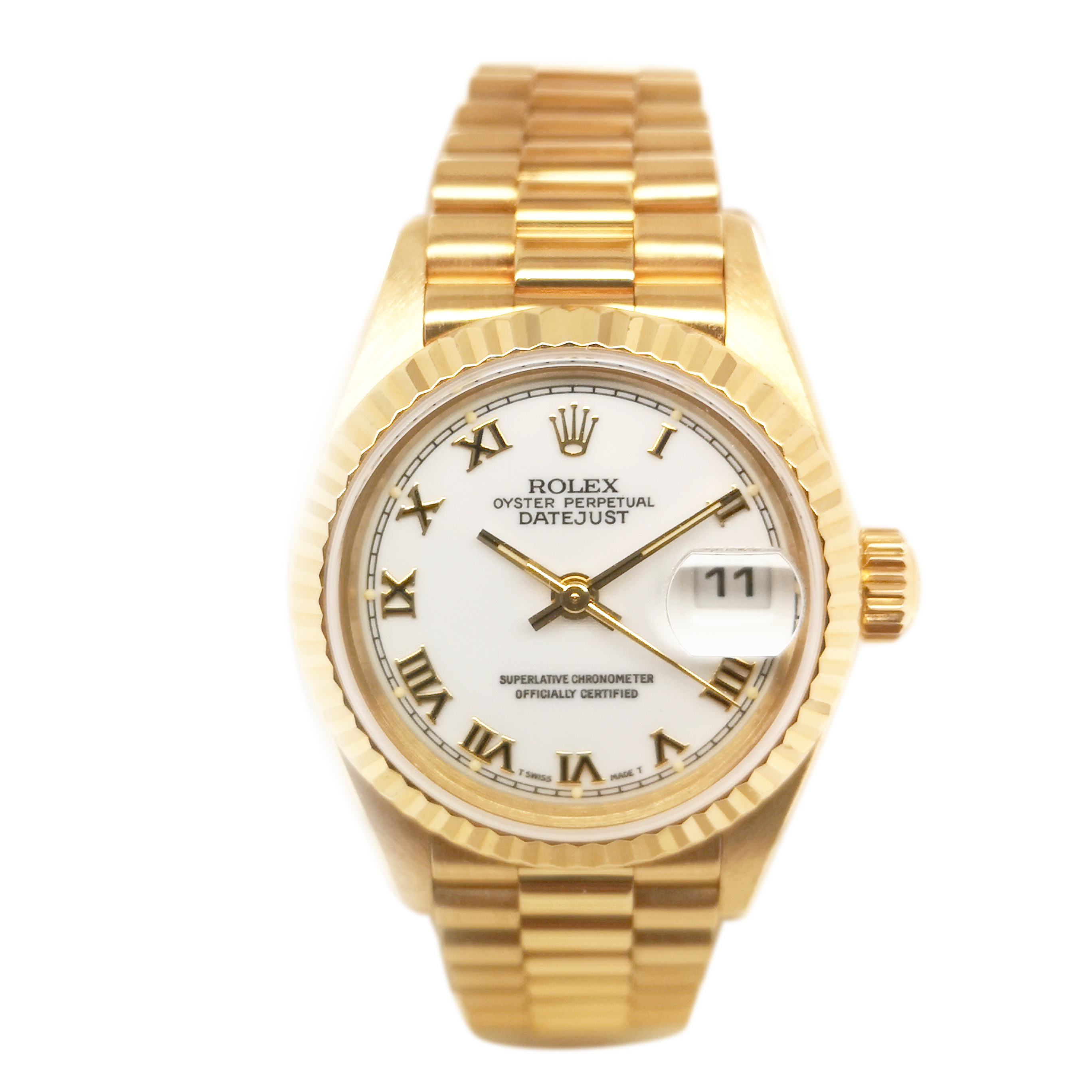 Rolex President White Roman Dial 18k Yellow Gold Fluted Bezel On A President Bracelet Ladies Pre Owned Watch Swiss Wrist