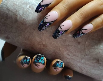 French Fake Nail Nude Nails Mit Schwarz Und Glitzer Top Kunstliche Nagel Fur liche Tragen Mittel Long Size Nagel Amazon De Beauty