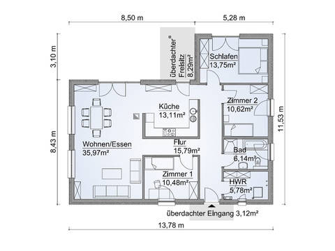 Bungalow Haus Mit Walmdach Architektur Dachausbau Grundriss 4 Zimmer 108 Qm Mit Garten Terrasse Massivhaus Baue Town Country Haus Winkelbungalow Walmdach