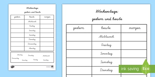 Interaktive Übungen helfen dir beim Lernen Videos, Audios und Grafiken erklären dir jedes Thema Mit dem Klassenarbeitstrainer bereitest du dich auf deine DeutschKlausur vor Mit dem Lernmanager hast du alle Aufgaben im Blick Genau das Richtige lernen – mit kapiertde drei e kostenlos Die Testlizenz endet automatisch!. Wochentage schreiben e sollen von Druckschrift in Schreibschrift übertragen werden Silvia Dutzler, PDF 1/06;. Rätsel zu Wochentage Arbeitsblatt Rätsel zu den Begriffen vorgestern gestern heute morgen übermorgen Zum besseren Verständnis können sich die Schüler die Wochentage (Kürzel) ausschneiden und an die obere Leiste.