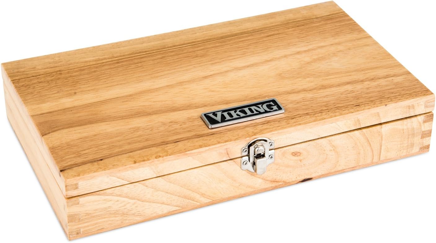 Handle nearly any cutting task easily with the Viking Professional 7Piece Cutlery Set!. The 14slot cutlery block is made of dark Acacia wood to complement the Viking kitchen The set includes the most commonly used knives to make easy work of your culinary tasks as well as kitchen shears and six steak knives Rounding out the set is a 10” steel to help keep your blades honed between sharpening. A PERFECT BLEND OF MODERN TECHNOLOGY AND CLASSIC CRAFTSMANSHIP!.