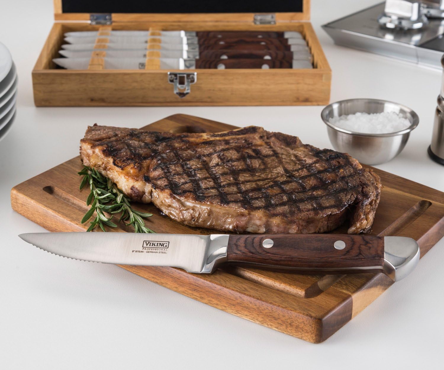 Expertly honed from durable German stainless steel, the Viking Professional Steakhouse Knife Set delivers restaurantgrade performance to your kitchen Pakkawood handles are doubleriveted around the full tang construction Set of six 5 mirror polished blade Corrosion and stainresistant 18/10 German steel Partially serrated blades Constructed of renewable material Arrives in gorgeous bamboo. Handforged by professional blacksmiths from highquality steel, the perfect blade for all your indoors and outdoors cooking needs!. Viking Viking 7 Piece Steak Knife Set RPAK2 / BPAK2 Color Black Wayfair on sale for $9999 original price $ $ 9999 $ CONNEXITY "coyote_sc" Viking Viking CBC12G Bamboo Cutting Board for use with Gas and Dual Fuel Cooktops and Ranges N/A Build.