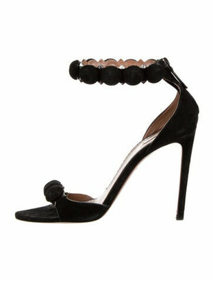 Step up your style game with covetable pieces such as these black sandals from Alaïa Standing a 90mm stiletto heel, this Italianmade pair has been cut from plush suede that's embellished with tonal pompoms and glossy pyramidal.