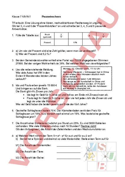 Prozentrechnung 1 Klassenarbeit Mathe Klasse 7 8 Mathiki De