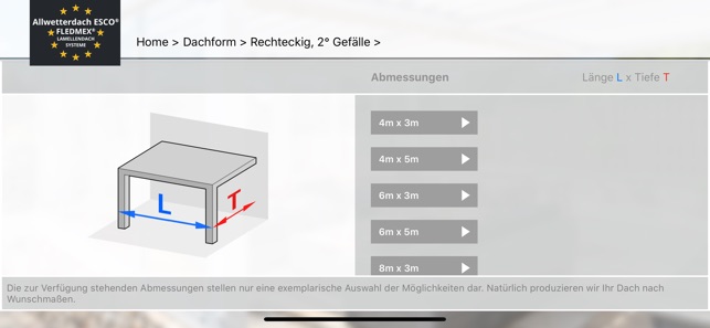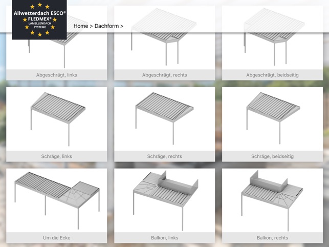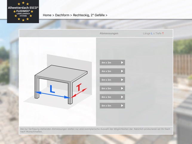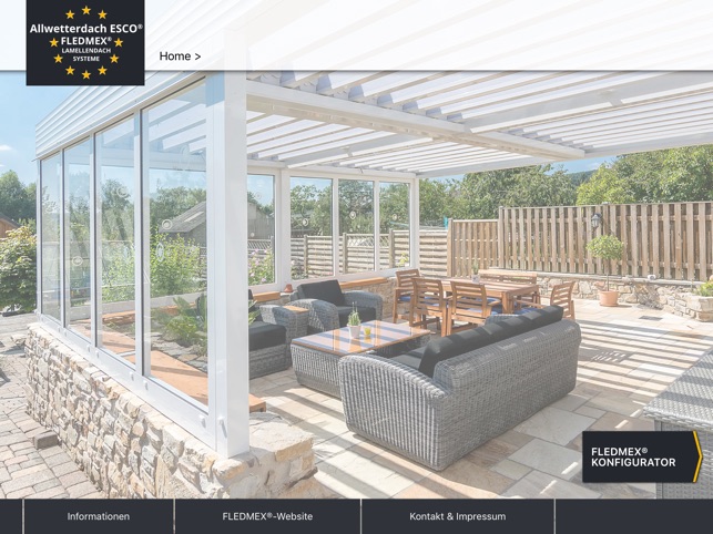Mit nur 4 Klicks die Visualisierung einer FLEDMEX® Terrassenüberdachung an Ihrem Wohnobjekt Entwerfen sie auf einfache Art und Weise Ihr TraumLamellendach Wählen Sie aus vielen Dachformen, Größen und Farben die optimale Lösung für die Erweiterung Ihres Lebensraums.
