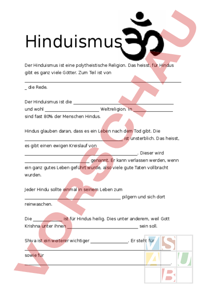 Hinduismus unterrichtsmaterial. RAAbits Realschule Religion, Klasse 9/10 Religionen und Weltanschauungen Götter, Karma, Yoga In dieser Unterrichtseinheit erarbeiten sich die Schüler nach einer kurzen Aktivierung des Vorwissens zum Thema die grundlegenden Informationen zum Glauben und Leben der HindusAnschließend haben sie die Möglichkeit, in Gruppenarbeit einzelne Aspekte zu vertiefen und eine Wandzeitung zu erstellen. Enjoy the videos and music you love, upload original content, and share it all with friends, family, and the world on YouTube. Passendes Unterrichtsmaterial zum Thema "Hinduismus" Link zum Angebot auf wwwlehrermarktplatzde Arbeitsblatt mit Lückentext zum Thema "Hinduismus" Hinweis Über 8000 Arbeitsblätter von UnterrichtSchule können über Sellfycom als Gesamtpaket für 8.