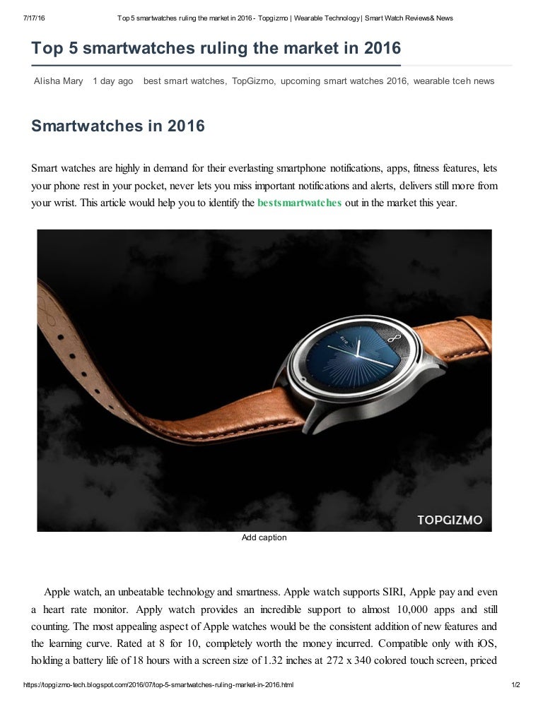 Top 5 Smartwatches of 16 by Ayush Jaiswal · June 4, 16 Top 5 Smartwatches of 16 The Smartwatch as a wearable device has been evolving over the past few years, and demand has climbed up in tandem Here are some of the best choices available today for Smartwatches 1. The answer should be Sony Smartwatch 3 The Smartwatch 3 has the increasingly rare distinction of featuring a square rather than circular display— which depending on your preferences could be a good thing. Top Smartwatches and Fitness Monitors of CES 16 by Louie Diangson · January 11, 16 Last week’s Consumer Electronic Show (CES) 16 has showcased really cool products that will get us excited for this year.