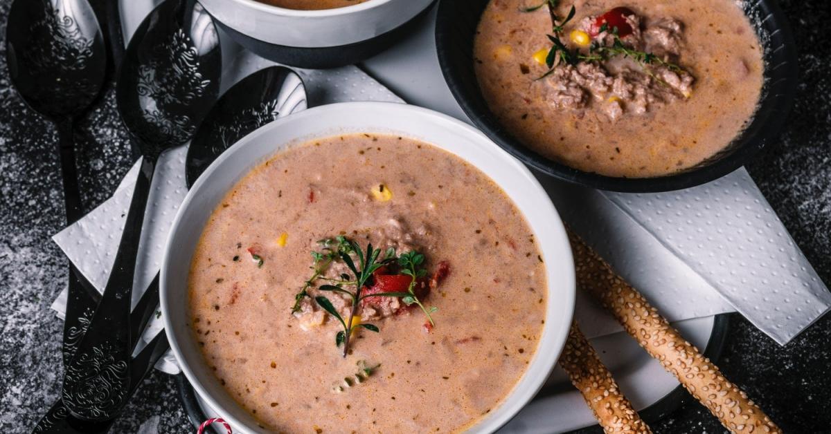 Pizzasuppe Mit Hackfleisch Tomaten Champignons Und Mais Foodtempel