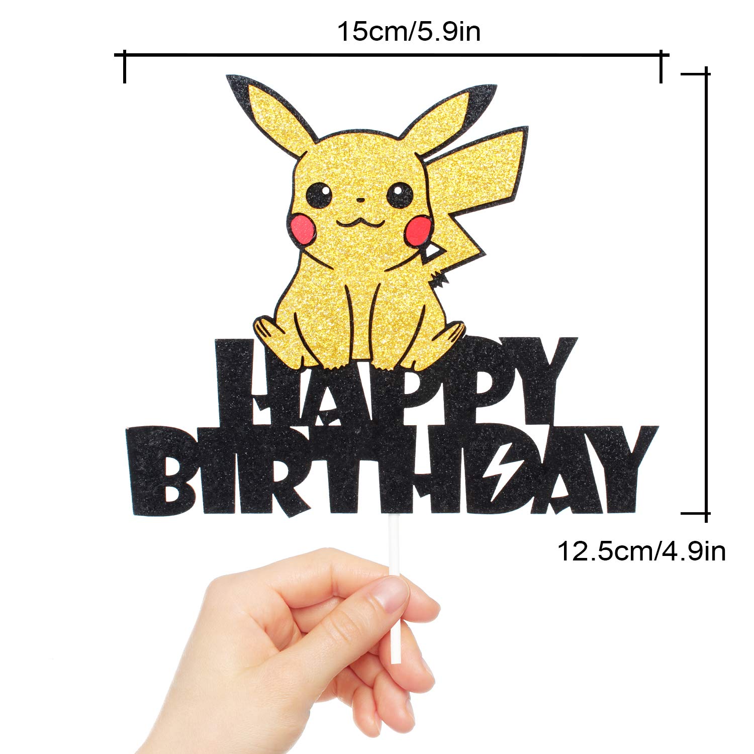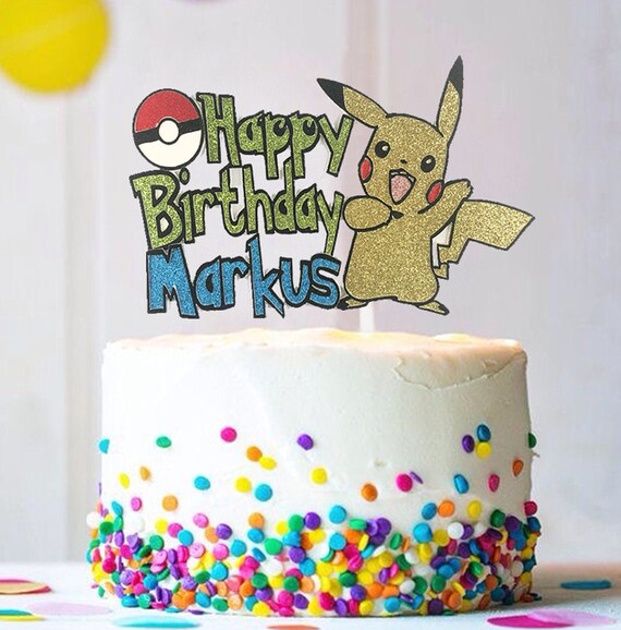 Pikachu Happy Birthday Cake Topper Cute Pokemon Inspired Cake Decor, Trainers Themed Party Decoration, Glitter Kid birthday Party Supplies 50 out of 5 stars 10 $9 Set of 24 Pokemon inspired Cupcake Toppers food picks double sided 46 out of 5 stars 173 $9. Pokémon cake Happy 7th birthday Kaden!. White cake with vanilla pudding filling Marshmallow fondant with buttercream icing underneath, and the POKEMON sign was made with a gumpaste/fondant mix to help it keep it's shape Happy Birthday Wyatt!.