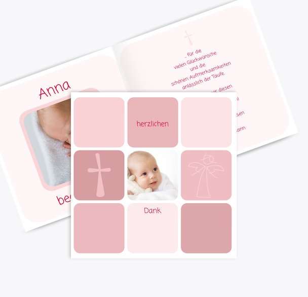 Dankeskarten zur Taufe Designs und Formate Die Taufe war das erste grosse Fest für Ihr Kind Die Gäste haben dazu beigetragen, dass die Aufnahme des Mädchens oder Jungen in die christliche Gemeinschaft allen als wunderbares Erlebnis im Gedächtnis bleiben wird.