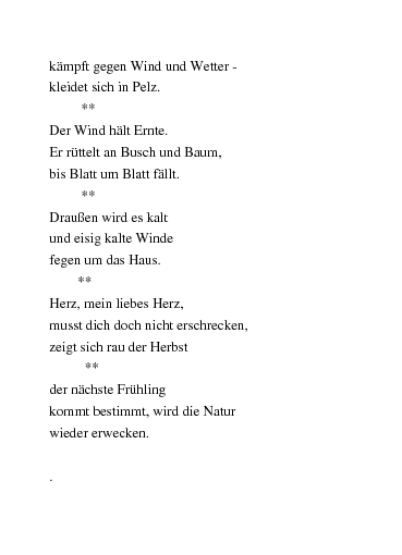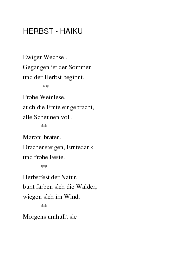 Die fehlende Zäsur wird durch den Hebungshöhepunkt auf „Herbst“ ersetzt Es geht also beim Einsatz des Metrums im Haiku nicht um das makellose Durchhalten eines bestimmten Takttyps, sondern immer darum, durch bewusstes Anwenden die beste Form für den jeweiligen Inhalt zu finden. An einem Abend im Herbst Ist es nicht leicht, ein Mensch zu sein So alt bin ich schon, daß ich mich schäme vor der Vogelscheuche Der Diener, ein bisschen dumm Er schippt auch den Schnee Des Nachbarn Vom Berg der Bauer Die Hacke als Kissen nimmt Es singt die Lerche!. Mein HerbstRondell Die Farben der Blätter sind rot, gelb,orange und braun Sie sind sehr schön und liegen meistens auf dem Boden Ich mag es, in sie zu springen Die Farben der Blätter sind rot, gelb,orange und braun Die Blätter glänzen so schön Wir sammeln die Blätter um die Wette Die Farben der Blätter sind rot, gelb,orange und braun.