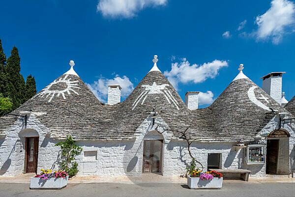 Bildagentur Mauritius Images Alberobello Provinz Bari Salento Apulien Italien Europa Die Typischen Trulli Hauser Mit Ihrem Kegelfarmigen Dach Und Den Symbolen