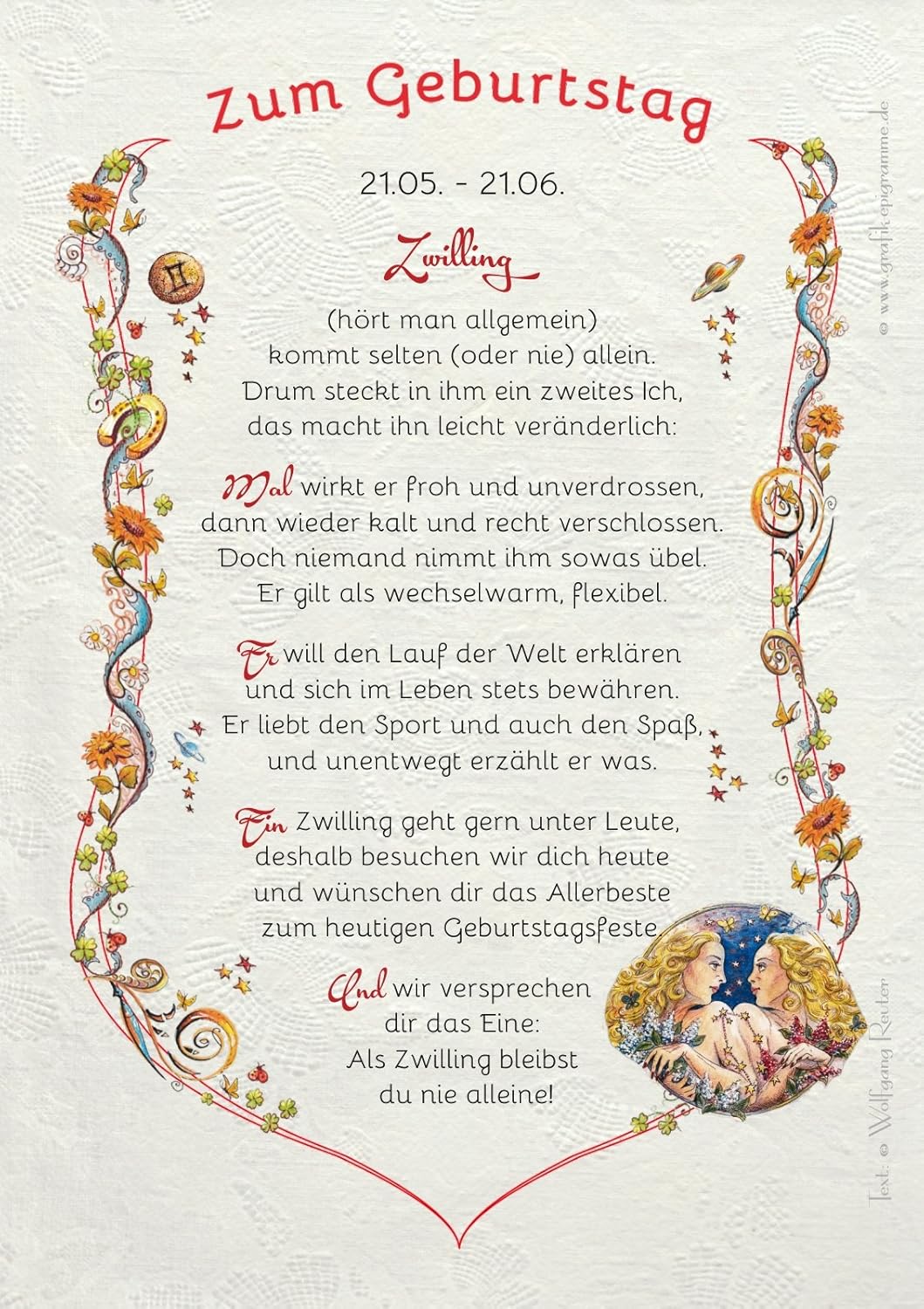 Hinweis in den jeweiligen Randbereichen hängt das Sternzeichen auch von der Uhrzeit sowie dem Jahr (wegen Schaltjahren etc) der Geburt ab Vom 235 bis zum 6 ist es aber praktisch immer das Sternzeichen Zwillinge. Sternzeichen Zwillinge Herzlichen Glückwunsch zum Geburtstag im Sternzeichen Zwillinge!. Hast du bis hierhin gescrollt, um die Fakten über geburtstagskarte für zwillinge zu erfahren?.