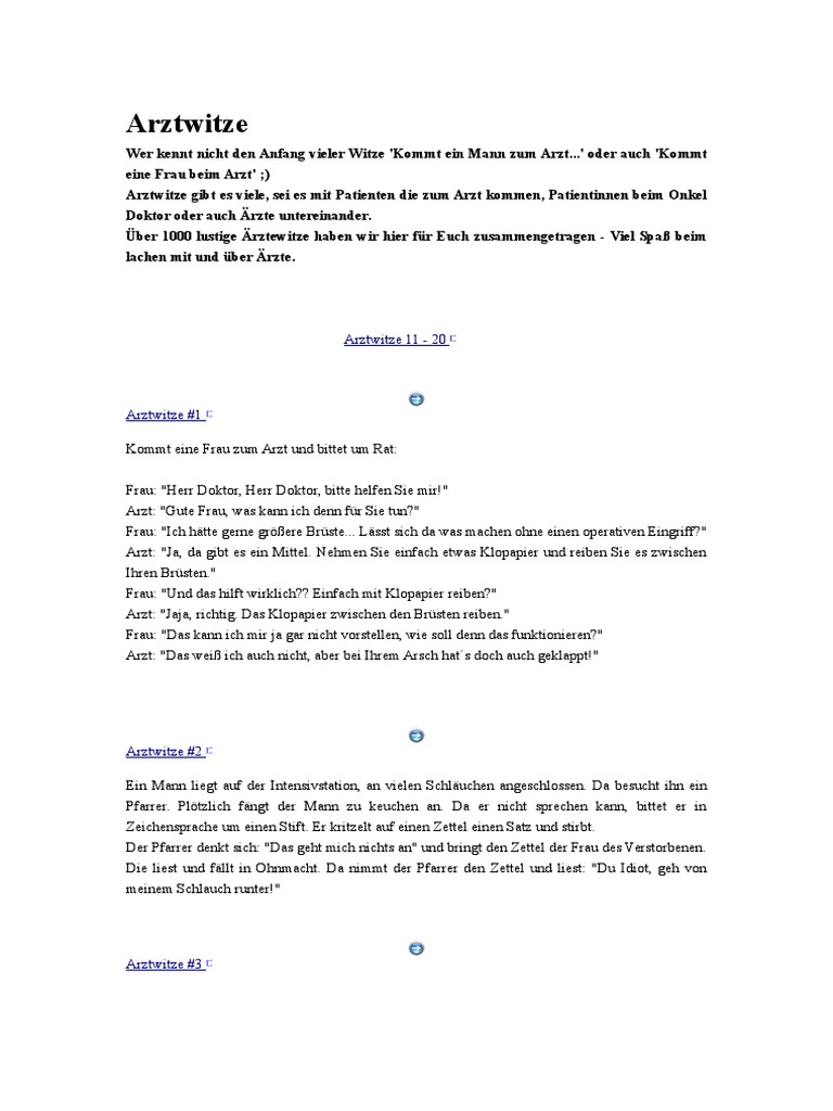Zwischendurch brauchen wir alle mal etwas zum Lachen, daher wird dieser Artikel regelmäßig mit neuen Arztwitzen von uns aktualisiert Denn Lachen ist bekanntlich die beste Medizin!. Die besten Arzt Witze bei praktischArztde!. Arztwitze – Lustige Scherze über Ärzte und die besten Arzt Witze Woxikon / Witze / Arztwitze Arztwitze 36 Witze Beliebte Witze 1 Eine Frau geht zum Arzt "Herr Doktor, ich leide seit en unter starken Blähungen Aber man kann sie nicht hören oder riechen Das ist mir so peinlich, aber zum Glück merkt es ja niemand".