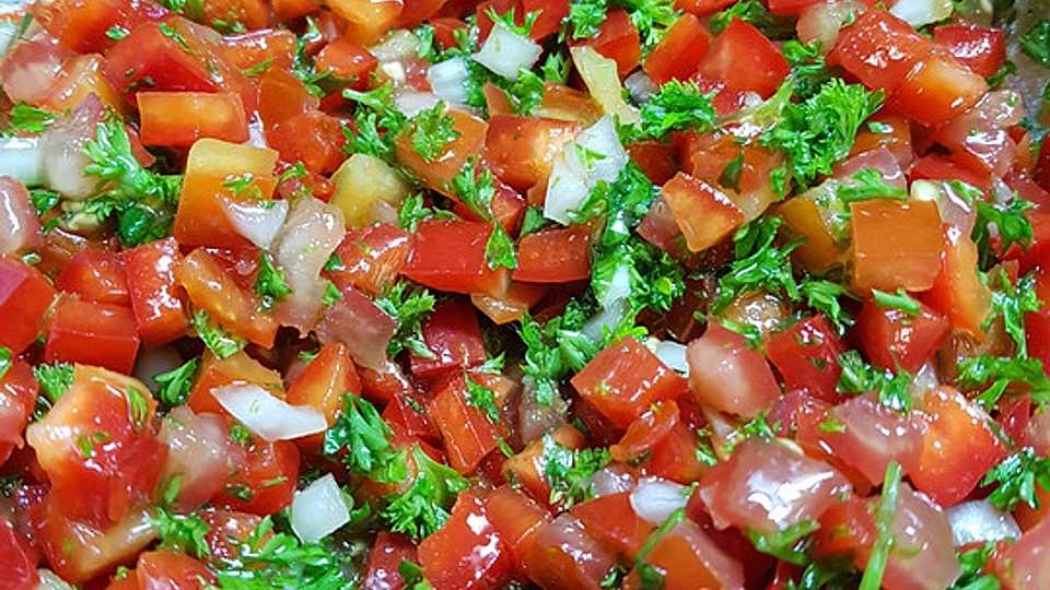 500 g Tomate(n) 250 g Gurke(n) 1 kleine Peperoni;. Zutaten 100 g Zwiebel(n) ½ TL Salz;. Tomatensalat türkischer Art Zutaten 1 Zwiebel 500g Tomaten 250g Gurke 3 milde Peperonis ½ Bund Petersilie Für das Dressing 25 ml Zitronensaft, frisch gepresster 25 ml Öl Salz Zubereitung.