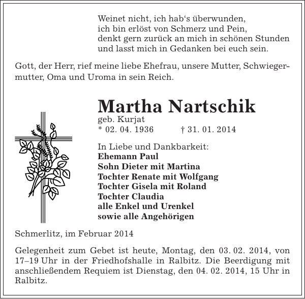 Martha Nartschik Traueranzeige Sachsische Zeitung
