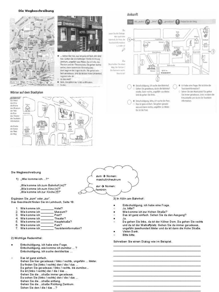 In einer beispielhaften Wegbeschreibung müssen wichtige Merkmale erkannt werden Ich habe das Arbeitsblatt in einer jahrgangsübergreifenden Klasse 46 bei einer Gruppenarbeit eingesetzt 2 Seiten, zur Verfügung gestellt von weigi am. Übung Nach dem Weg fragen Spielen Sie zu zweit Jeder würfelt zwei Mal, das erste Mal für den Start, das zweite Mal für das Ziel Hafenstraße Park 7(oteV UBahn Markt Start Ziel Hotel Bahnhof StartPUnI. Wegbeschreibung Daf lehrer, Daf, Wegbeschreibung Kostenlose Unterrichtsmaterialien für DaZ und DaF finden Videos, Arbeitsblätter, Übungen, Spiele und Webseiten Spiel Nummer 1 Präposition spielerisch erkennen Für das PräpositionsSpiel benötigen Sie pro Mitspieler acht Karten, auf die die Präpositionen wie im Beispiel geschrieben.