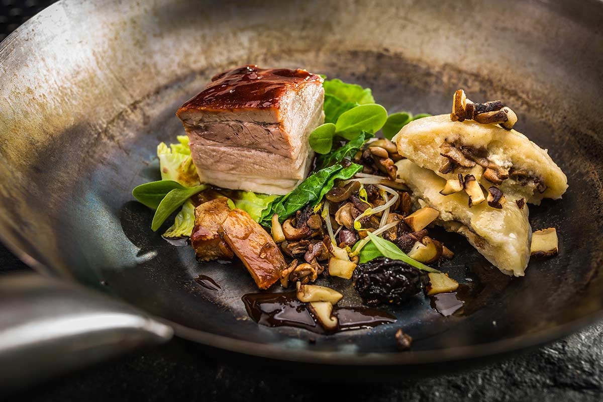 Suslander Schweinebauch Sous Vide Mit Gebratener Blutwurst Grunkohl Und Semmelknodel Rezept