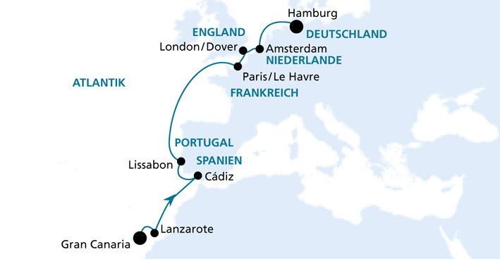 Route der Kreuzfahrt Von Gran Canaria nach Hamburg 2 Kreuzfahrt von 15 en Abfahrt von Las Palmas de Gran Canaria, Reiseziele La Gomera (Kanaren), Lanzarote (Spanien), Sevilla, Lissabon (Portugal), Lissabon (Portugal), Porto (Portugal), La Coruna (Spanien), Honfleur (Frankreich), Dover (England), Rotterdam (Niederlande), Zielhafen Hamburg.