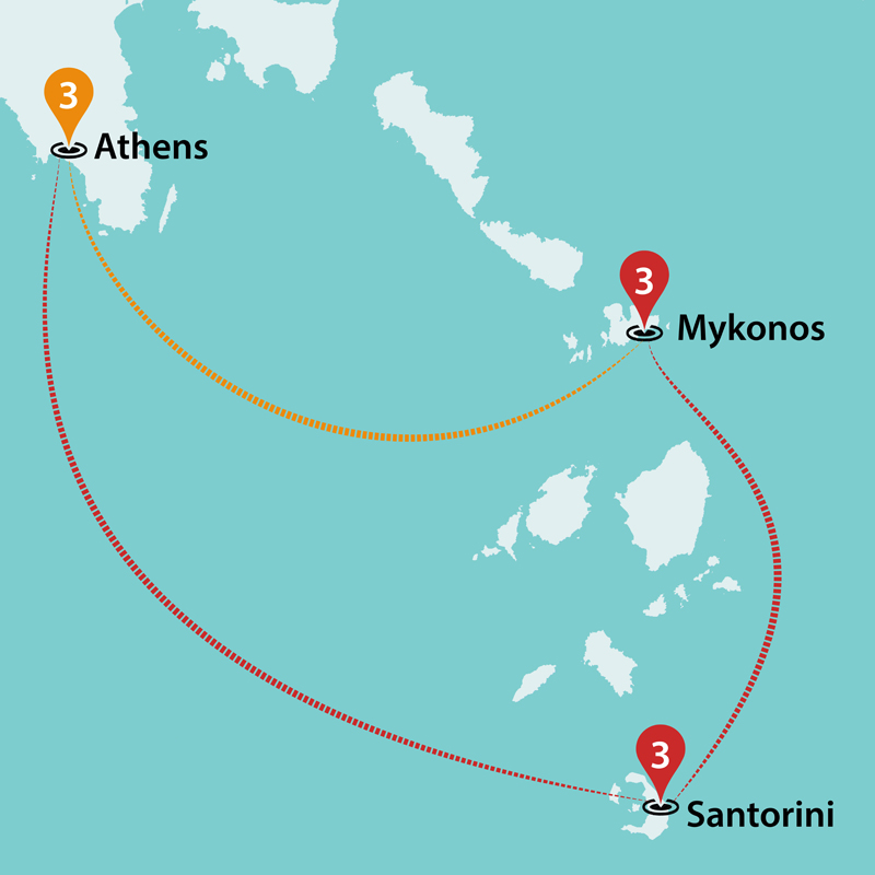 Athens – Mykonos – Santorini Tour Day 1 Arrive in Athens Upon your arrival you will be greeted by our representative and transferred to your hotel Balance of the day at your leisure Day 2 Athens In the morning you will have Athens Sightseeing Tour, including the visit of the Acropolis site and the new Acropolis Museum. With Santorini and Mykonos—two of the most touristpopular destinations in the Cyclades—being only 73 miles (117 kilometers) apart, it makes perfect sense to bounce between them on your trip to the Greek IslandsGetting from one to the other can be as quick as an hour and cheap as $30, but the commute will take some planning. Useful tips for your ferry trip from Mykonos to Santorini Mykonos has 2 ports, however, the majority of the ferries depart from the New Port of Mykonos Find out more about Mykonos' ports on our relevant FAQ Mykonos port can get quite busy during the summer months so we recommend arriving at least 45 minutes prior to departure.