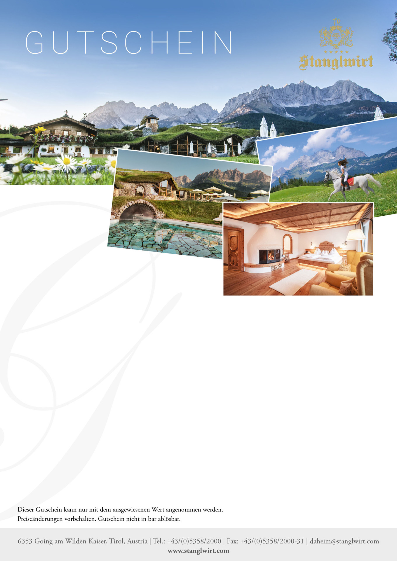 Located at the base of the aweinspiring Wilder Kaiser mountain range in Tirol, BioHotel Stanglwirt is surrounded by verdant pastures in summer and is only minutes from worldclass skiing in nearby Kitzbühel during the winter. Give unforgettable moments "at home" at the Stanglwirt This voucher is redeemable for all Stanglwirt goods and services. Ein entspannter Wellnessurlaub mit den besten Freunden, ein romantisches 5SterneWochenende mit der großen Liebe oder eine abwechslungsreiche Ferienreise mit der ganzen Familie Das Bio und Wellnesshotel Stanglwirt ist immer einen Besuch wert Wie auch immer Sie Ihre persönliche Auszeit vom Alltag gestalten möchten, im Stanglwirt genießen Sie die einzigartige Kombination aus Natur, Luxus.
