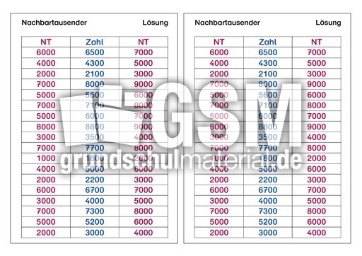 Nachbarzahlen Bis 10000 Tabelle
