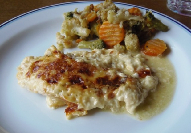 Schnitzel Auf Sahne Gemuse Sauce Mit Kase Uberbacken Rezept Daskochrezept De