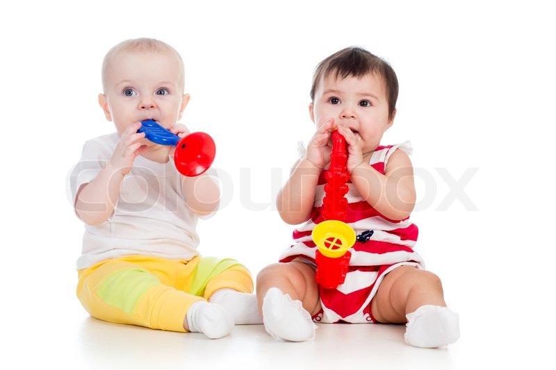 Lustige Babys Madchen Und Jungen Spielen Musikalische Spielzeug Auf Weissem Hintergrund Lizenzfreie Fotos Bilder Und Stock Fotografie Image