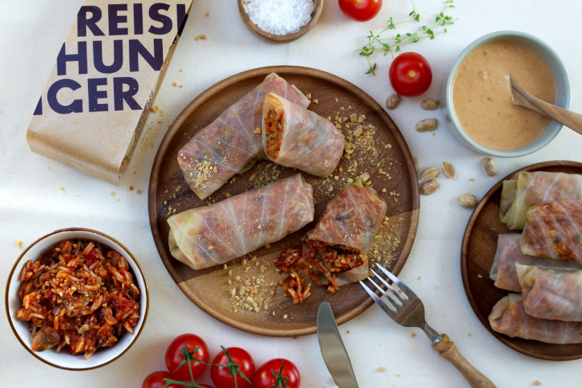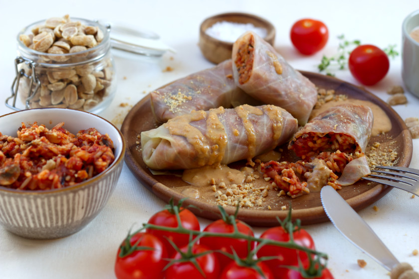 Vegane Kohlrouladen Mit Reisfullung Und Cremiger Thai Erdnusssauce
