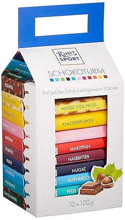Ritter Sport Turm Vollmilchschokolade Halbbitter Weisse Nussschokolade Tafelschokolade In 10 Verschiedenen Sorten Schoko Turm 10 X 100 G Amazon De Lebensmittel Getranke