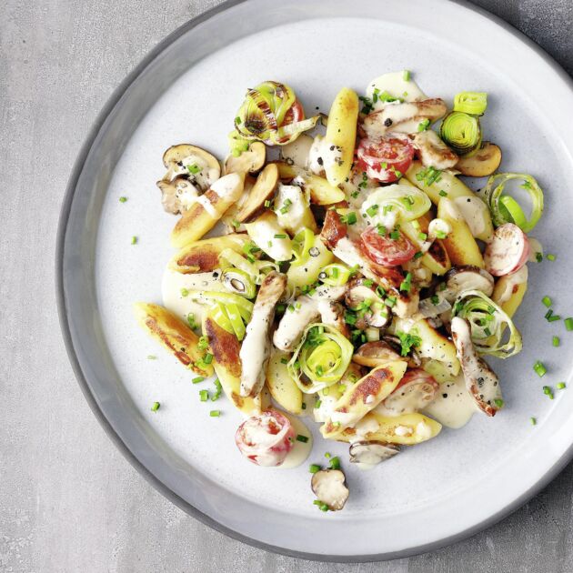 Schupfnudelpfanne Mit Erbsen Mohren Und Schnitzelstreifen