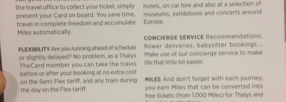 Thalys card required Greg H February 9, 18 Dont forget to take your umbrella, the lounge is OUTSIDE the station #WTF Philip Bussmann March 2, 16 As of March 2nd 16 the lounge is now located in the yellowish colored building across from the the station Matthias Bätge December 12, 17. Please note, terms and conditions apply Tip As the number of seats at the lowest fares on Thalys, Eurostar, TGV and ICE trains is limited, we recommend that you book your trip as early as possible Most international trains allow reservations to be made from 4 months before the date of departure (or from 6 months for Eurostar and ICE). My Thalys World is a loyalty program for frequent travelers, which allows you to save points while traveling My Thalys World rewards the value of your transactions You earn member points for every euro that determine your status You also earn Miles, which you can exchange for various products and services from Thalys and its partners.
