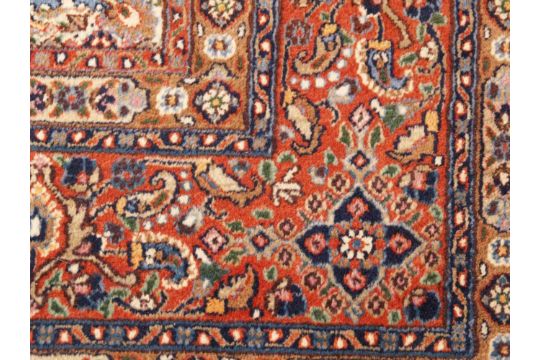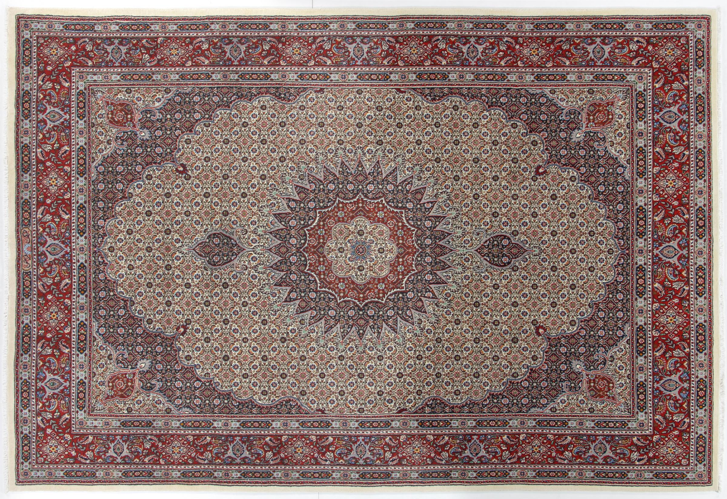 Moud carpets were originally similar to today’s Mashad, ie, knotted weaves with floral patterns Both cities are located in in the Khorrassan provenience (place of origin) As a result of commissioned work in the 1930’s, Moud carpets adapted and continued Herati ornamentation, which is popular today. Description Moud 'PartSilk' Carpet, Persia, circa 40 years old, wool/partsilk/cotton, approx 302 x 245 cm, condition 2 (good condition)*****antique & old. Moud ist eine südlich von Birdjan und Maschhad liegende Stadt, deren Teppichknüpftradition eine lange Geschichte aufweist Mit ihrem sehr charaktervollen Design sind sie leicht zu erkennen und geniessen des Weiteren einen hervorragenden Ruf Dominierend und sofort zu erkennen ist das HeratiMuster der MoudTeppiche.