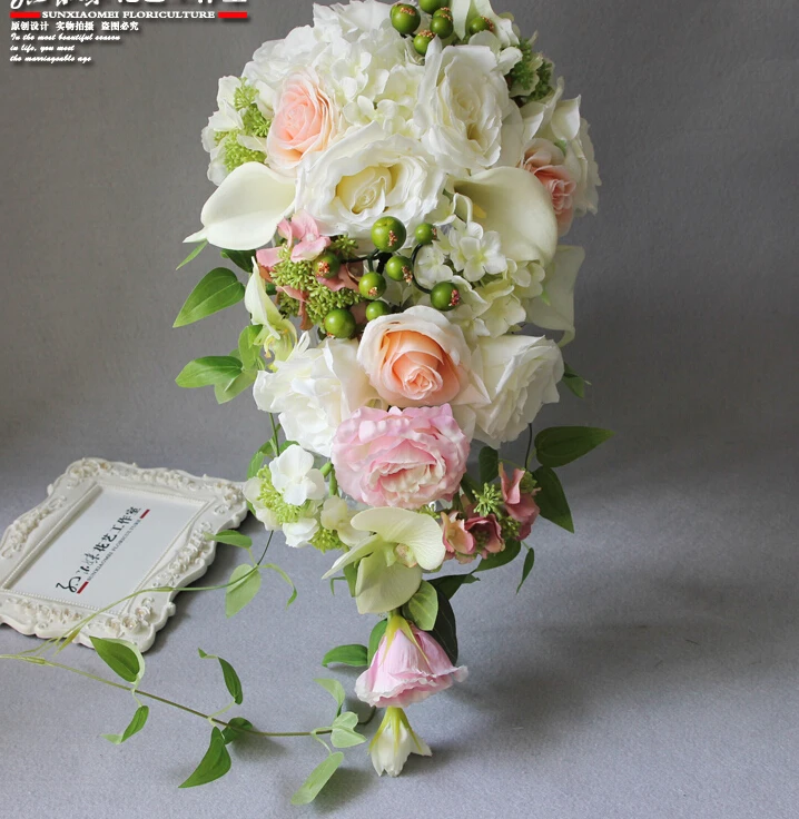 18 Real Photo Elfenbein Westlichen Hochzeit Brautstrauss Tropft Blumen Brautstrauss Wasserfall Brosche Buque De Noiva Kunstliche Brautstrausse Aliexpress