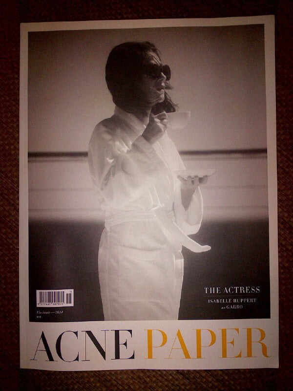 Book and Magazine Design Book Cover Magazine Cover Saved from magazinewalltumblrcom Magazine Wall Acne Paper (London, Stockholm, Paris) Saved by Daniel Jackson White Photography Portrait Photography Fashion Photography Editorial Photography Acne Paper Books Art Magazin Covers Cool Magazine. ACNE Paper Each issue of Acne Paper is created around one key idea – a timeless theme that in various ways touches all those working in the creative fields regardless of age, cultural background or social status. Acne Paper 15 is released today and available at wwwacnepapercomIsabelle Huppert, one of the greatest actresses of our time, is having a cup of tea in between takes, playing the part of Greta Garbo for the cover story of this issue Acne Paper 15 is dedicated to actresses.