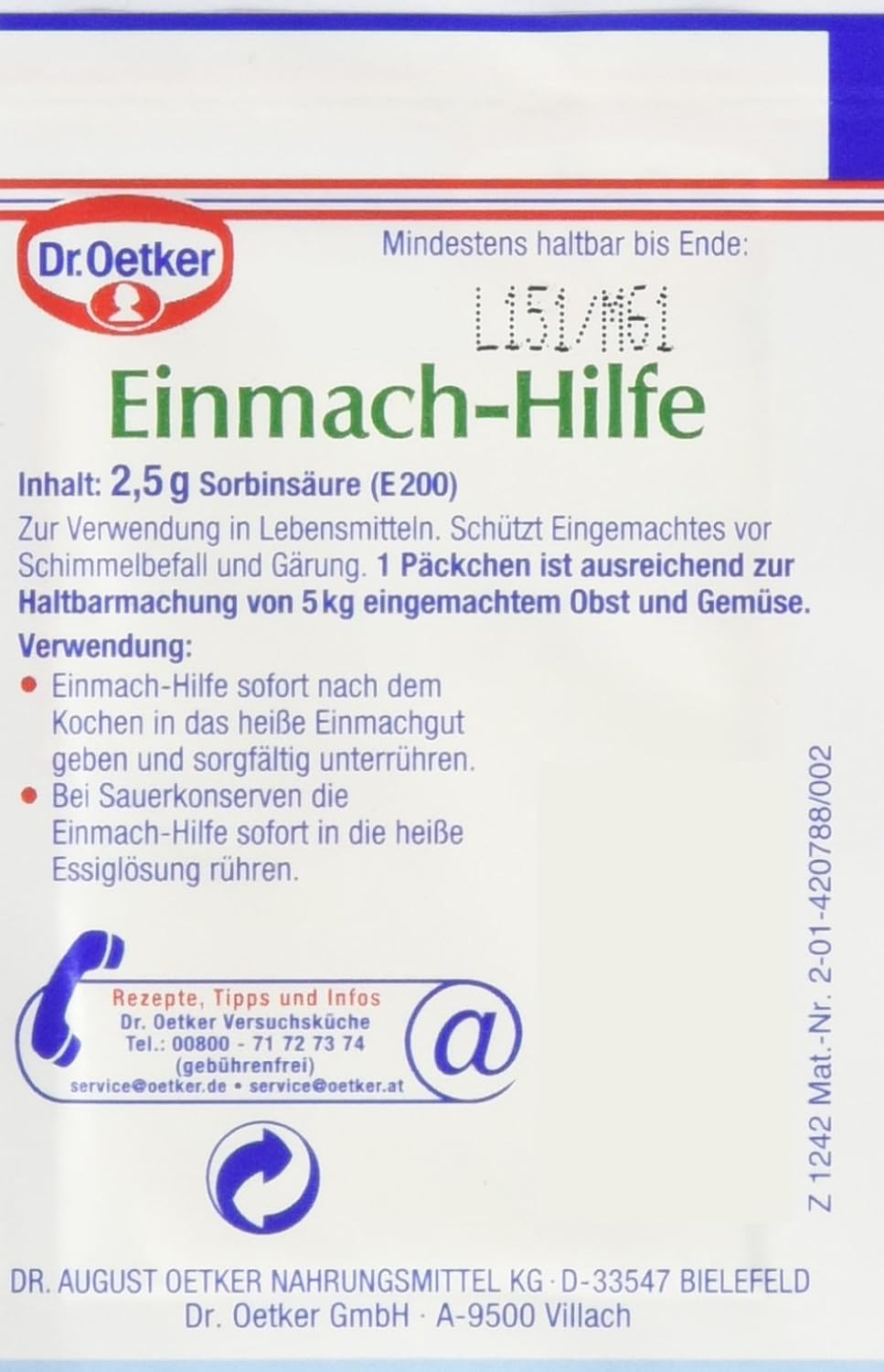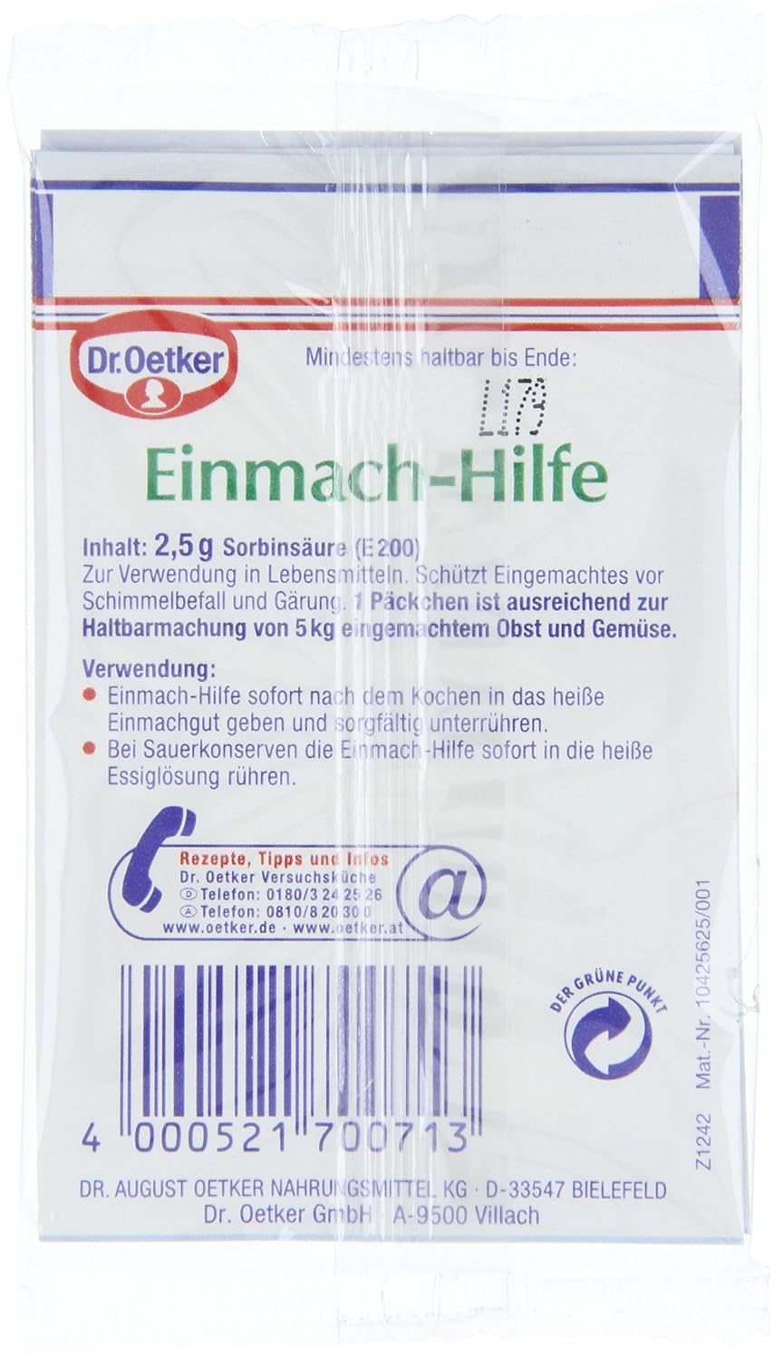 Einmachen mit Industrieprodukten, Sowohl das Dr Oetker Schulkochbuch als auch Backen macht Freude sind hervorragende Grundlagenbücher, entsprechend bin ich auf der Suche nach einem Grundlagenbuch zum Thema Einmachen wohl mit falschen Erwartungen an diese Publikation gegangen Der vorliegende Band ist mehr eine Werbefibel für die Nahrungsmittelindustrie In (gefühlten) 95% der Rezepte. Each order of Dr Oetker Einmachhilfe contains 3x25g packets One package is enough to keep 5kg preserved fruit or vegetabels safe!. This is a preservative packet often called for in Austrian or German recipes for homemade juices, compotes and the like It's called "Einsiedehilfe" in Austria and "EinmachHilfe" in Germany Each packet is 25 grams of sorbic acid.