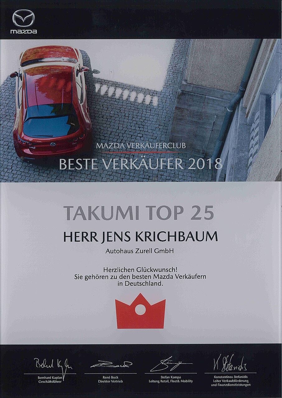 Über 540 Verkäufer deutschlandweit haben sich für den Verkäuferclub angemeldet Dank der Leistung in 15 tragen die Top 25 MazdaVerkäufer wie Schlatter nun den Titel „TAKUMI. Im neuen VerkäuferPortal unter wwwmazdaverkaeuferclubde konnte er sein Verkaufsverhalten nachverfolgen, beispielsweise den ausstattungsbezogenen Verkaufsmix, aber auch die Zufriedenheit der. Auch in diesem Jahr schaffte es Herr Jens Krichbaum wieder unter die Top 25 im Mazda Verkäuferclub Aufgrund seines ausgezeichnetem Produktwissens, seiner hervorragenden Beratungsqualität, der sehr hohen Kundenzufriedenheit und seiner Verkaufsleistung wurde Herr Jens Krichbaum auch für das Jahr 19 von Mazda Deutschland mit dem Titel "TAKUMI Meister des Verkaufs" ausgezeichnet.