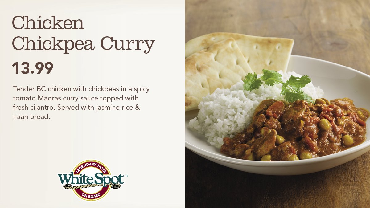 Sep 28, 12 CBC life food Canada's home for news, sports, lifestyle, comedy, arts, kids, music, original series & more. No evidence has traced links between the white spots and chicken One tall glass of milk has been an Indian mother's favourite nutritional potion, since time immemorial For its immense health. Choose from hearty breakfasts, healthy crisp salads, delicious sandwiches, White Spot entrees, glutenfree options, plus more, at our selfserve restaurant scmsitem_ Chicken Chickpea Curry Tender BC chicken with chickpeas in a spicy tomato Madras curry sauce, served with jasmine rice and naan bread Available on.