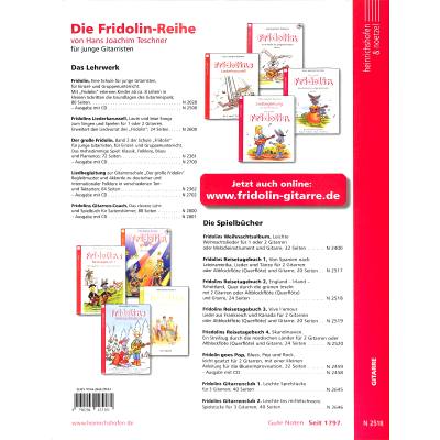 Fridolin Eine Schule für junge Gitarristen Band 1 Lieder und Übungen für junge Gitarrenschülerinnen und schüler Beschreibung Nahezu hundert Lieder und Spielstücke enthält die Gitarrenschule, die Kinder ungefähr ab dem 7. Greensleeves Variations for duo guitars, arrKarl Scheit Greg Lake(ELP) The Sage, arr Kenichi Ebe (Fridolin Travel Diary) 1 Duo or ;FluteGuit,Tran,HJTeschner Leichte Duos fur Gitarre Marian Budos Set Sail, Casslical Guitar SemiAcoustic Guitar Mario Gangi Fabulae Mario Gangi Suite Spagnola. Fridolin Eine Schule für junge Gitarristen Band 1 Lieder und Übungen für junge Gitarrenschülerinnen und schüler Beschreibung "Fridolin", die beliebte Gitarrenschule für Kinder, ist auch mit BegleitCD erhältlich (Spieldauer ca 73 Minuten).
