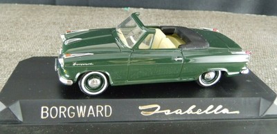 1954 Borgward Isabella Cabrio Revell metal 118 Used Nice $6500 0 bids $1725 shipping Ending Tuesday at 1035PM PST 1d h or Best Offer 1/43 NEO BORGWARD RS 1500, Schauinsland 1958 $6999 $900 shipping Premium Classixxs Unique Edition # 1/43 1955 Borgward Traumwagen Gold /750. The Borgward Isabella is a car of the middle class, which the Carl F W Borgward GmbH in Bremen Sebaldsbrück built from 1954 to 1961 The standard twodoor or threedoor station wagon was the most successful model in the Borgward Group From June 10, 1954, it was first produced under the name " Hansa 1500". The Borgward Isabella is a medium sized two door saloon that was manufactured by the Bremen based automanufacturer Carl F W Borgward GmbH between 1954 and 1962 Initially the car was badged, like its predecessor, as the Hansa 1500, but within the company it was known from the beginning by the code name, Isabella (after Carl Borgward's wife), and cars produced after 1957 bore the ‘Isabella.