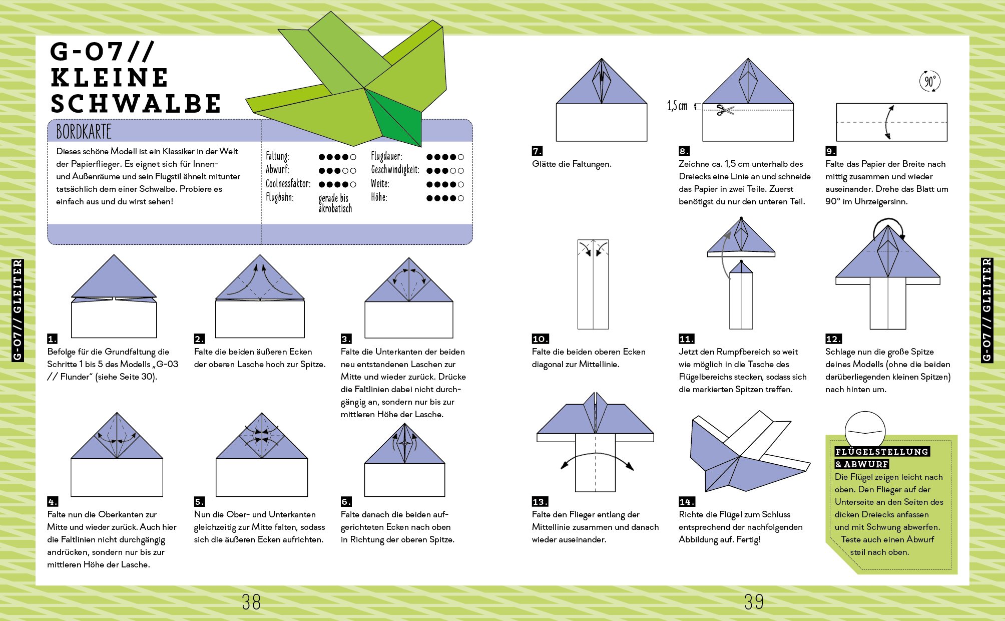 Das Video zeigt, welche Kniffe für die perfekte Schwalbe erforderlich sind!. Die linke obere und die linke untere Kante auf den Mittelbruch falten 5 Die linke Ecke zur rechten Ecke falten 6 Die Spitze im angegebenen Bereich nach links falten 7 Die obere Hälfe nach hinten falten 8 Den Hals aufrichten und in dieser Position durch zusammendrücken am Ansatz fixieren 9. PapierfliegerAnleitung Die Düse PapierfliegerAnleitung Die Schwalbe PapierfliegerAnleitung Der Doppeldecker PapierfliegerAnleitung Der Spitzensegler PapierfliegerAnleitung Der Wellengleiter Schon vor 00 Jahren knickten die Menschen im alten China Spielzeug aus Papier, man nennt die Kunst bis heute "Origami".